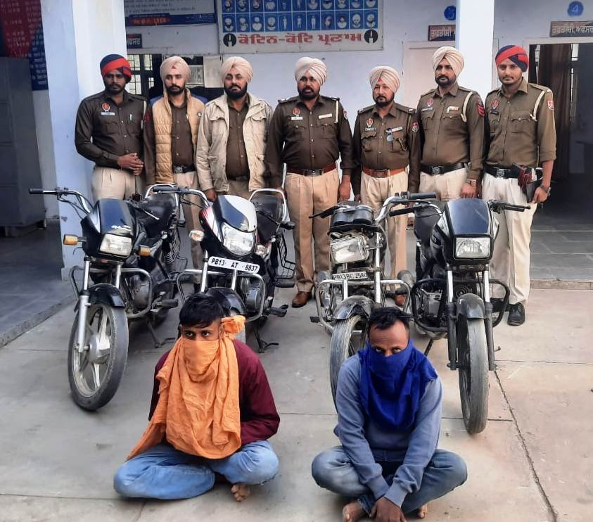 ਡੀਐਸਪੀ ਬੁਢਲਾਡਾ ਨਵਨੀਤ ਕੌਰ ਗਿੱਲ ਜੀ ਅਤੇ ਥਾਣੇਦਾਰ ਬੂਟਾ ਸਿੰੰਘ ਮੁੱਖ ਅਫਸਰ ਥਾਣਾ ਸਿਟੀ ਬੁਢਲਾਡਾ ਦੀ ਜੇਰੇ ਨਿਗਰਾਨੀ ਹੇਠ ਥਾਣਾ ਸਿਟੀ ਬੁਢਲਾਡਾ ਦੀ ਪੁਲਿਸ ਪਾਰਟੀ ਵੱਲੋ ਮੌਕੇ ਤੇ ਕਾਰਵਾਈ ਕਰਦਿਆਂ ਜੀਵਨ ਕੁਮਾਰ ਪੁੱਤਰ ਜਗਨਨਾਥ ਵਾਸੀ ਰੰਗੜਿਆਲ, ਮੋਨੂੰ ਸਿੰਗਲਾ ਪੁੱਤਰ ਤਾਰਾ ਚੰਦ ਵਾਸੀ ਨੇੜੇ ਵਿਸਕਰਮਾ ਮੰਦਰ ਪਾਤੜਾ ਨੂੰ ਕਲੀਪੁਰ ਫਾਟਕ ਤੇ ਸਮੇਤ ਸੀਡੀ ਡੀਲਕਸ ਚੋਰੀ ਦੇ ਮੋਟਰ ਸਾਈਕਲ ਕਾਬੂ ਕੀਤਾ ਜਿਨ੍ਹਾ ਦੀ ਨਿਸ਼ਾਨ ਦੇਹੀ ਪਰ 3 ਹੋਰ ਚੋਰੀ ਦੇ ਮੋਟਰਸਾਈਕਲ ਬਰਾਮਦ ਕਰਕੇ ਉਹਨਾ ਦੇ ਕਬਜ਼ੇ ਵਿੱਚੋ 4 ਮੋਟਰਸਾਈਲਕ ਬਰਾਮਦ ਕੀਤੇ ਗਏ । ਗ੍ਰਿਫਤਾਰ ਵਿਅਕਤੀਆਂ ਨੂੰ ਮਾਨਯੋਗ ਅਦਾਲਤ ਵਿੱਚ ਪੇਸ਼ ਕਰਕੇ ਪੁਲਿਸ ਰਿਮਾਡ ਹਾਸਲ ਕਰਕੇ ਪਤਾ ਲਗਾਇਆ ਜਾਵੇਗਾ ਕਿ ਉਹਨਾ ਇਹ ਮੋਟਰਸਾਈਕਲ ਕਿੱਥੋ ਚੋਰੀ ਕੀਤੇ ਹਨ ਅਤੇ ਉਹਨਾ ਵੱਲੋ ਪਹਿਲਾਂ ਕੀਤੀਆਂ ਅਜਿਹੀਆ ਹੋਰ ਵਾਰਦਾਤਾਂ ਆਦਿ ਸਬੰਧੀ ਵੀ ਡੂੰਘਾਈ ਨਾਲ ਪੁੱਛਗਿੱਛ ਕੀਤੀ ਜਾਵੇਗੀ।