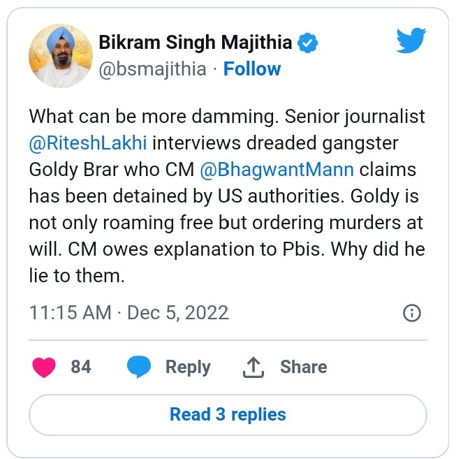 ਇਸ ਦੇ ਨਾਲ ਹੀ ਹੁਣ ਅਕਾਲੀ ਦਲ ਦੇ ਆਗੂ ਬਿਕਰਮ ਮਜੀਠੀਆ ਨੇ ਇਲਜ਼ਾਮ ਲਾਉਂਦੀਆਂ ਪੁੱਛਿਆ ਕਿ ਮਾਨ ਨੇ ਪੰਜਾਬ ਵਾਸੀਆਂ ਨਾਲ ਝੂਠ ਕਿਉਂ ਬੋਲਿਆ। ਉਨ੍ਹਾਂ ਟਵੀਟ ਕਰ ਕਿਹਾ, “ਇਸ ਤੋਂ ਵੱਧ ਨੁਕਸਾਨ ਕੀ ਹੋ ਸਕਦਾ ਹੈ। ਸੀਨੀਅਰ ਪੱਤਰਕਾਰ ਰਿਤੇਸ਼ ਲੱਖੀ ਨੇ ਗੈਂਗਸਟਰ ਗੋਲਡੀ ਬਰਾੜ ਦਾ ਇੰਟਰਵਿਊ ਲਿਆ ਜਿਸ ਬਾਰੇ ਮੁੱਖ ਮੰਤਰੀ ਭਗਵੰਤ ਮਾਨ ਦਾ ਦਾਅਵਾ ਸੀ ਕਿ ਉਸਨੂੰ ਅਮਰੀਕੀ ਅਧਿਕਾਰੀਆਂ ਨੇ ਹਿਰਾਸਤ ਵਿੱਚ ਲਿਆ ਹੈ। ਗੋਲਡੀ ਨਾ ਸਿਰਫ਼ ਆਜ਼ਾਦ ਘੁੰਮ ਰਿਹਾ ਹੈ ਸਗੋਂ ਮਰਜ਼ੀ ਨਾਲ ਕਤਲ ਕਰਨ ਦਾ ਹੁਕਮ ਦੇ ਰਿਹਾ ਹੈ। ਮੁੱਖ ਮੰਤਰੀ ਪੰਜਾਬੀਆਂ ਨੂੰ ਸਪੱਸ਼ਟੀਕਰਨ ਦੇਣ, ਉਹਨਾਂ ਝੂਠ ਕਿਉਂ ਬੋਲਿਆ।”