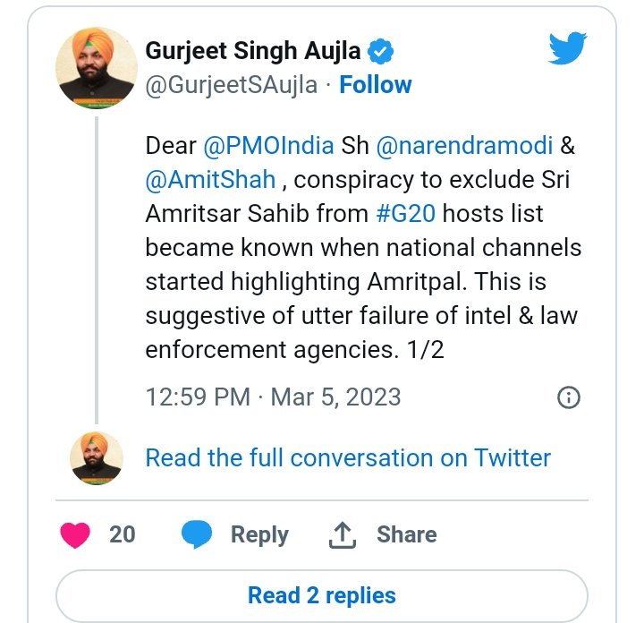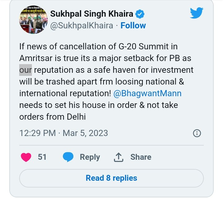 ਅੰਮ੍ਰਿਤਸਰ : ਪਿਛਲੇ ਦਿਨੀਂ ਪੰਜਾਬ ਵਿੱਚ ਵਾਪਰੀਆਂ ਘਟਨਾਵਾਂ ਤੋਂ ਬਾਅਦ ਹੁਣ ਅੰਮ੍ਰਿਤਸਰ ਵਿੱਚ 15 ਤੋਂ 17 ਮਾਰਚ ਅਤੇ 19-20 ਮਾਰਚ ਨੂੰ ਹੋਣ ਵਾਲੀ ਜੀ-20 ਕਾਨਫਰੰਸ ਰੱਦ ਹੋਣ ਦਾ ਖਤਰਾ ਮੰਡਰਾ ਰਿਹਾ ਹੈ। ਦੱਸਿਆ ਜਾ ਰਿਹਾ ਹੈ ਕਿ ਅੰਮ੍ਰਿਤਸਰ ‘ਚ ਹੋਣ ਵਾਲੇ ਦੋਵੇਂ ਪ੍ਰੋਗਰਾਮ ਰੱਦ ਕਰ ਦਿੱਤੇ ਗਏ ਹਨ। ਇਸ ‘ਤੇ ਅਧਿਕਾਰੀ ਚੁੱਪ ਹਨ, ਜਦਕਿ ਵਿਰੋਧੀ ਧਿਰ ਕਾਂਗਰਸ ਦੇ ਸੰਸਦ ਮੈਂਬਰ ਗੁਰਜੀਤ ਔਜਲਾ ਅਤੇ ਵਿਧਾਇਕ ਸੁਖਪਾਲ ਸਿੰਘ ਖਹਿਰਾ ਨੇ ਟਵੀਟ ਕਰਕੇ ਇਸ ਦੇ ਰੱਦ ਹੋਣ ਦੀ ਸੰਭਾਵਨਾ ਜਤਾਈ ਹੈ।