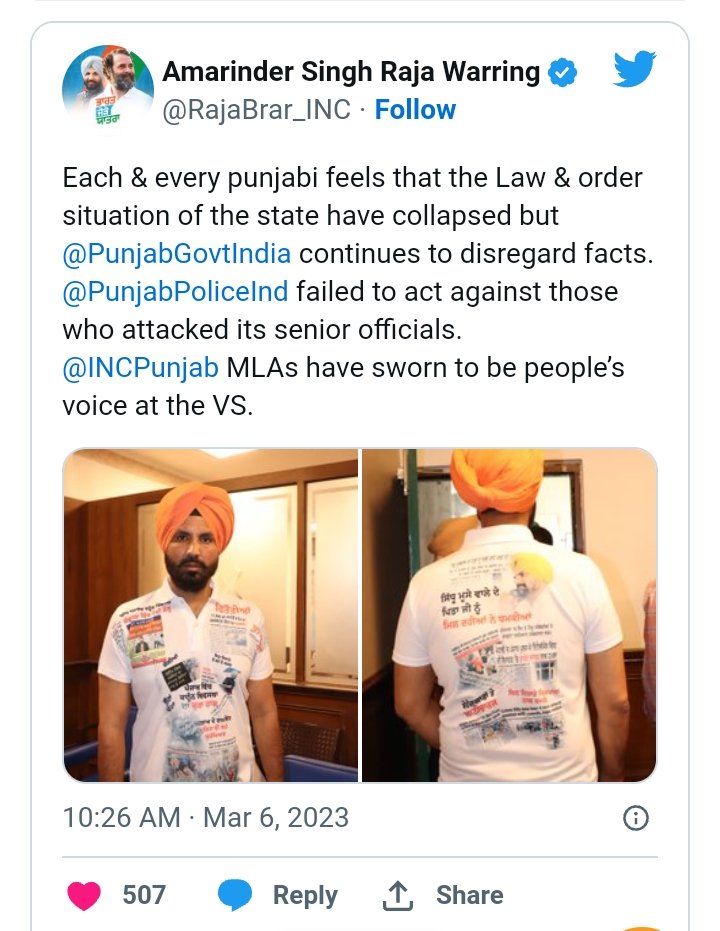 ਰਾਜਾ ਵੜਿੰਗ ਪੰਜਾਬ ‘ਚ ਵਾਪਰੀਆਂ ਘਟਨਾਵਾਂ ‘ਤੇ ਆਧਾਰਿਤ ਟੀ-ਸ਼ਰਟ ਪਾ ਕੇ ਅਸੈਂਬਲੀ ‘ਚ ਪਹੁੰਚੇ। ਜਿੱਥੇ ਸਿਫਰ ਕਾਲ ‘ਚ ਵੀ ਉਨ੍ਹਾਂ ਪੰਜਾਬ ਦੀ ਕਾਨੂੰਨ ਵਿਵਸਥਾ ਦੀ ਗੱਲ ਕੀਤੀ। ਉਨ੍ਹਾਂ ਕਿਹਾ ਕਿ ਪੰਜਾਬ ਦੇ ਹਾਲਾਤ ਵਿਗੜ ਰਹੇ ਹਨ। ਪਿਛਲੇ 40 ਸਾਲਾਂ ਵਿੱਚ ਅਜਿਹਾ ਨਹੀਂ ਹੋਇਆ ਕਿ ਕਿਸੇ ਥਾਣੇ ਤੇ ਕਬਜ਼ਾ ਹੋਇਆ ਹੋਵੇ। ਉਸ ਤੋਂ ਬਾਅਦ ਅੱਜ ਤੱਕ ਉਕਤ ਮਾਮਲੇ ‘ਤੇ ਕੋਈ ਕਾਰਵਾਈ ਨਹੀਂ ਕੀਤੀ ਗਈ।