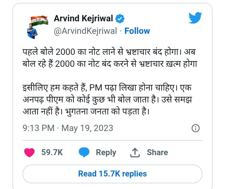 ਉਨ੍ਹਾਂ ਨੇ ਆਪਣੇ ਅਧਿਕਾਰਤ ਟਵਿਟਰ ਹੈਂਡਲ ਤੋਂ ਟਵੀਟ ਕਰਦੇ ਹੋਏ ਲਿਖਿਆ ਹੈ ਕਿ ‘ਸਭ ਤੋਂ ਪਹਿਲਾਂ 2000 ਦਾ ਨੋਟ ਲਿਆਉਣ ਨਾਲ ਭ੍ਰਿਸ਼ਟਾਚਾਰ ਬੰਦ ਹੋਵੇਗਾ। ਹੁਣ ਉਹ ਕਹਿ ਰਹੇ ਹਨ ਕਿ 2000 ਦੇ ਨੋਟ ‘ਤੇ ਪਾਬੰਦੀ ਲਗਾਉਣ ਨਾਲ ਭ੍ਰਿਸ਼ਟਾਚਾਰ ਖਤਮ ਹੋ ਜਾਵੇਗਾ, ਇਸ ਲਈ ਅਸੀਂ ਕਹਿੰਦੇ ਹਾਂ, ਪ੍ਰਧਾਨ ਮੰਤਰੀ ਨੂੰ ਪੜ੍ਹਿਆ-ਲਿਖਿਆ ਹੋਣਾ ਚਾਹੀਦਾ ਹੈ। ਅਨਪੜ੍ਹ ਪ੍ਰਧਾਨ ਮੰਤਰੀ ਨੂੰ ਕੋਈ ਵੀ ਕੁਝ ਵੀ ਕਹਿ ਸਕਦਾ ਹੈ। ਉਹ ਨਹੀਂ ਸਮਝਦਾ। ਜਨਤਾ ਨੂੰ ਭੁਗਤਣਾ ਪੈਂਦਾ ਹੈ।