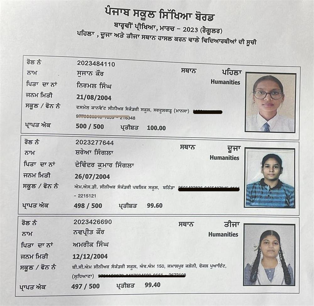ਮਾਨਸਾ ਜ਼ਿਲ੍ਹੇ ਦੀ 12ਵੀਂ ਦੇ ਨਤੀਜੇ ਵਿੱਚ ਝੰਡੀ, ਸੁਜਾਨ ਕੌਰ ਨੇ ਪ੍ਰਾਪਤ ਕੀਤਾ ਪਹਿਲਾ ਸਥਾਨ