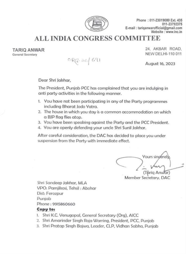 ਚੰਡੀਗੜ੍ਹ, 19 ਅਗਸਤ 2023 : ਕਾਂਗਰਸ ਪਾਰਟੀ ਵੱਲੋਂ ਅਬੋਹਰ ਤੋਂ ਵਿਧਾਇਕ ਸੰਦੀਪ ਜਾਖੜ ਨੂੰ ਪਾਰਟੀ ਤੋਂ ਮੁਅੱਤਲ ਕਰ ਦਿੱਤਾ ਗਿਆ ਹੈ। ਉਨ੍ਹਾਂ ‘ਤੇ ਭਾਜਪਾ ਦੇ ਹੱਕ ‘ਚ ਝੰਡਾ ਚੁੱਕਣ ਦੇ ਨਾਲ-ਨਾਲ ਪਾਰਟੀ ਵਿਰੋਧੀ ਗਤੀਵਿਧੀਆਂ ‘ਚ ਸ਼ਾਮਲ ਹੋਣ ਦੇ ਇਲਜ਼ਾਮ ਲਗਾਏ ਗਏ ਹਨ। ਪਾਰਟੀ ਸੂਤਰਾਂ ਦਾ ਮੰਨਣਾ ਹੈ ਕਿ ਇਸ ਕਾਰਨ ਕਾਂਗਰਸ ਪਾਰਟੀ ਦੀ ਸਾਖ ਨੂੰ ਵੱਡੇ ਪੱਧਰ ‘ਤੇ ਖੋਰਾ ਲੱਗ ਰਿਹਾ ਸੀ।ਇਨ੍ਹਾਂ ਹਾਲਾਤਾਂ ਦੇ ਮੱਦੇਨਜਰ ਉਨ੍ਹਾਂ ਨੂੰ ਪਾਰਟੀ ‘ਚੋਂ ਕੱਢ ਦਿੱਤਾ ਗਿਆ ਹੈ।