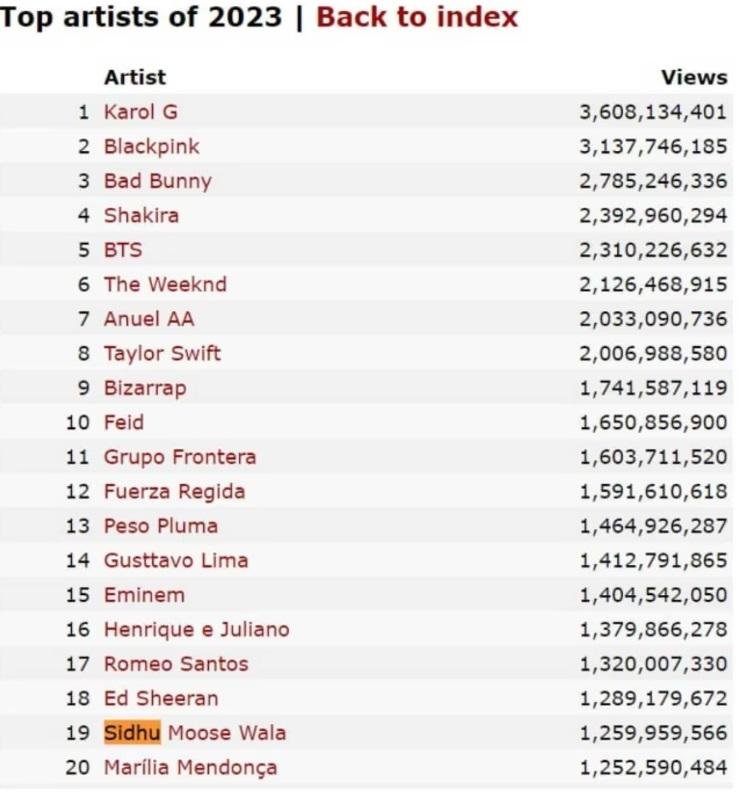 ਦੱਸ ਦਈਏ ਕਿ ਇਸ ਲਿਸਟ ‘ਚ ਸਿੱਧੂ ਮੂਸੇਵਾਲਾ ਨੂੰ 19ਵਾਂ ਰੈਂਕ ਦਿੱਤਾ ਗਿਆ ਹੈ। ਇਸ ਲਿਸਟ ‘ਚ ਕੋਲੰਬੀਅਨ ਗਾਇਕਾ ਕੈਰਲ ਜੀ, ਟੇਲਰ ਸਵਿਫਟ, ਸ਼ਕੀਰਾ ਤੇ ਬੀ. ਟੀ. ਐੱਸ. ਆਦਿ ਵਰਗੇ ਕਈ ਕਲਾਕਾਰਾਂ ਦੇ ਨਾਂ ਸ਼ਾਮਲ ਹਨ।