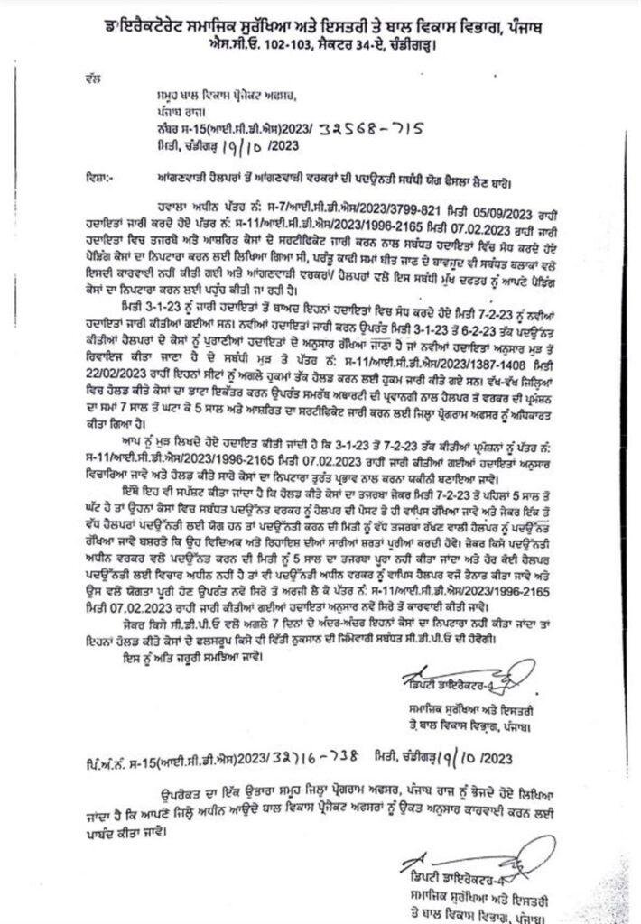 3 ਜਨਵਰੀ 2023 ਦੀਆਂ ਹਦਾਇਤਾਂ ਅਨੁਸਾਰ ਆਂਗਣਵਾੜੀ ਹੈਲਪਰਾਂ ਤੋਂ ਵਰਕਰਾਂ ਦੀਆਂ ਪਦਉਨਤੀਆਂ ਕੀਤੀਆਂ ਗਈਆਂ ਸਨ। ਵਿਭਾਗ ਵੱਲੋਂ ਦੂਸਰੀ ਵਾਰ ਹਦਾਇਤਾਂ 7.2.2023 ਨੂੰ ਬਣਾ ਕੇ ਕੈਂਸਲ ਕਰ ਦਿੱਤੀਆਂ ਗਈਆਂ। ਇਕ ਮਹੀਨਾ ਨੌਕਰੀ ਕਰਨ ਤੋਂ ਬਾਅਦ ਪ੍ਰਮੋਟ ਹੋਈਆਂ ਵਰਕਰਾਂ ਨੂੰ ਦੁਬਾਰਾ ਰੱਦ ਦੇ ਆਰਡਰ ਦਿੱਤੇ ਗਏ।