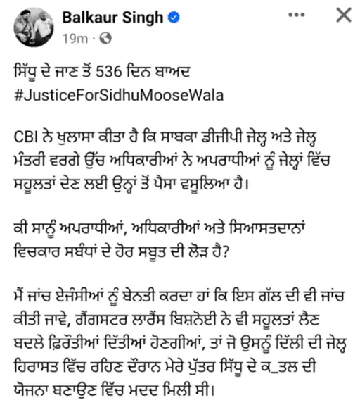 ਬਲਕੌਰ ਸਿੰਘ ਨੇ ਸੋਸ਼ਲ ਮੀਡੀਆ ਉੱਤੇ ਲਿਖਿਆ ਹੈ ਕਿ ਸੀਬੀਆਈ ਨੇ ਖੁਲਾਸਾ ਕੀਤਾ ਹੈ ਕਿ ਸਾਬਕਾ ਡੀਜੀਪੀ ਜੇਲ੍ਹ ਅਤੇ ਜੇਲ੍ਹ ਮੰਤਰੀ ਵਰਗੇ ਉੱਚ ਅਧਿਕਾਰੀਆਂ ਨੇ ਜੇਲ੍ਹਾਂ ਵਿੱਚ ਸਹੂਲਤਾਂ ਦੇਣ ਦੇ ਬਦਲੇ ਅਪਰਾਧੀਆਂ ਤੋਂ ਰਿਸ਼ਵਤ ਦੇ ਪੈਸੇ ਵਸੂਲ ਕੀਤੇ ਹਨ। ਉਨ੍ਹਾਂ ਲਿਖਿਆ ਕਿ ਸੀਬੀਆਈ ਦੇ ਇਸ ਖ਼ੁਲਾਸੇ ਤੋਂ ਬਾਅਦ ਕੀ ਸਾਨੂੰ ਅਪਰਾਧੀਆਂ, ਅਫ਼ਸਰਾਂ ਅਤੇ ਸਿਆਸਤਦਾਨਾਂ ਵਿਚਾਲੇ ਸਬੰਧਾਂ ਦਾ ਪਰਦਾਫਾਸ਼ ਕਰਨ ਲਈ ਸਬੂਤਾਂ ਦੀ ਲੋੜ ਹੈ? ਉਨ੍ਹਾਂ ਲਿਖਿਆ ਕਿ ਅੱਜ ਸਿੱਧੂ ਦੀ ਮੌਤ ਨੂੰ 536 ਦਿਨ ਹੋ ਗਏ ਹਨ ਪਰ ਇਨਸਾਫ਼ ਨਹੀਂ ਮਿਲਿਆ।