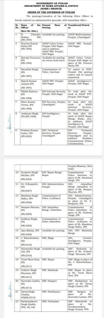 ਸੁਰਿੰਦਰ ਲਾਂਬਾ ਦੀ ਥਾਂ ਸਰਤਾਜ ਸਿੰਘ ਚਾਹਲ (ਐਸਐਸਪੀ ਹੁਸ਼ਿਆਰਪੁਰ) ਨੂੰ SSP ਸੰਗਰੂਰ, ਸਰਤਾਜ ਸਿੰਘ ਚਾਹਲ ਦੀ ਥਾਂ ਸੁਰਿੰਦਰ ਲਾਂਬਾ (ਐਸਐਸਪੀ ਸੰਗਰੂਰ) ਨੂੰ SSP ਹੁਸ਼ਿਆਰਪੁਰ ਵਜੋਂ ਨਿਯੁਕਤ ਕੀਤਾ ਗਿਆ ਹੈ। ਗੁਲਨੀਤ ਸਿੰਘ ਖੁਰਾਣਾ (SSP ਬਠਿੰਡਾ) ਨੂੰ ਐਸਐਸਪੀ ਵਿਵੇਕ ਸ਼ੀਲ ਸੋਨੀ ਦੀ ਥਾਂ ਰੋਪੜ, ਜੇ ਐਲਨਚੇਜ਼ੀਅਨ ਦੀ ਥਾਂ ਵਿਵੇਕ ਸ਼ੀਲ ਸੋਨੀ (ਐਸਐਸਪੀ ਰੋਪੜ) ਨੂੰ SSP ਮੋਗਾ ਲਾਇਆ ਗਿਆ ਹੈ। ਇਸੇ ਤਰ੍ਹਾਂ ਜੇ. ਐਲਨਚੇਜ਼ੀਅਨ (SSP ਮੋਗਾ) ਨੂੰ ਏ.ਆਈ.ਜੀ. ਕਾਊਂਟਰ ਇੰਟੈਲੀਜੈਂਸ ਪੰਜਾਬ ਐਸ.ਏ.ਐਸ. ਨਗਰ ਵਜੋਂ ਨਿਯੁਕਤ ਕੀਤਾ ਗਿਆ ਹੈ।