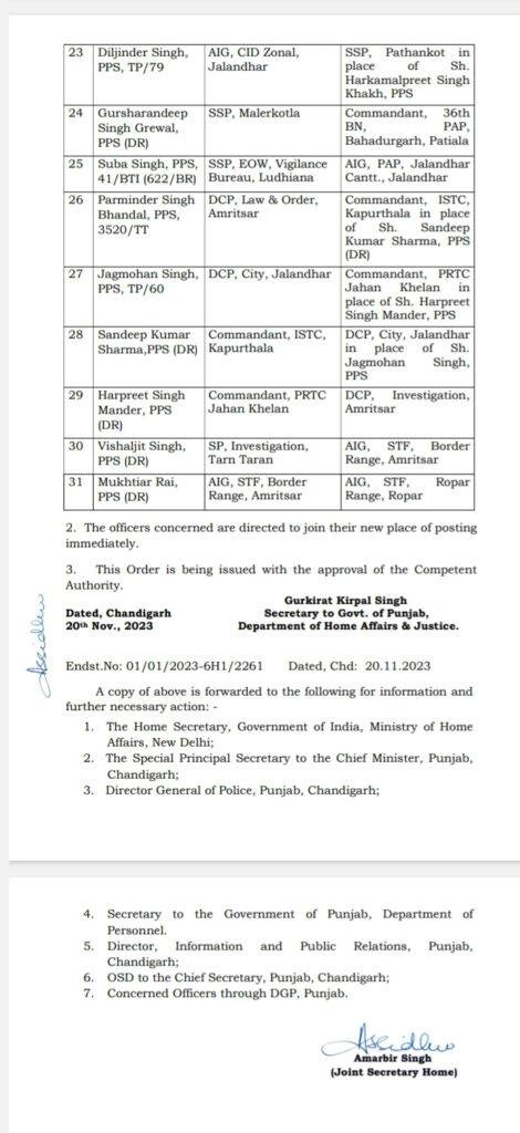 ਚੰਡੀਗੜ੍ਹ, 21 ਨਵੰਬਰ 2023 : ਪੰਜਾਬ ਸਰਕਾਰ ਨੇ ਪੁਲਿਸ ਵਿੱਚ ਵੱਡੇ ਪੱਧਰ ‘ਤੇ ਫੇਰਬਦਲ ਕਰਦਿਆਂ ਤਿੰਨ ਪੁਲਿਸ ਕਮਿਸ਼ਨਰਾਂ ਅਤੇ ਕਈ ਸੀਨੀਅਰ ਪੁਲਿਸ ਸੁਪਰਡੈਂਟਾਂ (ਐਸਐਸਪੀਜ਼) ਸਮੇਤ 31 ਆਈਪੀਐਸ/PPS ਅਫ਼ਸਰਾਂ ਦੇ ਤਬਾਦਲੇ ਕੀਤੇ ਹਨ। ਗੁਰਪ੍ਰੀਤ ਸਿੰਘ ਭੁੱਲਰ ਆਈ.ਜੀ.ਪੀ ਰੋਪੜ ਰੇਂਜ ਨੂੰ ਨੌਨਿਹਾਲ ਸਿੰਘ ਦੇ ਥਾਂ ਕਮਿਸ਼ਨਰ ਪੁਲਿਸ ਅੰਮ੍ਰਿਤਸਰ ਲਗਾਇਆ ਗਿਆ ਹੈ।