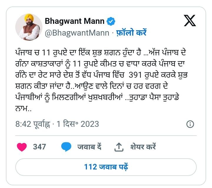 ਪੰਜਾਬ ਦੇ ਮੁੱਖ ਮੰਤਰੀ ਭਗਵੰਤ ਮਾਨ ਨੇ ਟਵੀਟ ਕਰ ਐਲਾਨ ਕੀਤਾ ਹੈ ਕਿ ਪੰਜਾਬ ਵਿੱਚ 11 ਰੁਪਏ ਦਾ ਇੱਕ ਸ਼ੁਭ ਸ਼ਗਨ ਹੁੰਦਾ ਹੈ …ਅੱਜ ਪੰਜਾਬ ਦੇ ਗੰਨਾ ਕਾਸ਼ਤਾਕਾਰਾਂ ਨੂੰ 11 ਰੁਪਏ ਕੀਮਤ ਵਿੱਚ ਵਾਧਾ ਕਰਕੇ ਪੰਜਾਬ ਦਾ ਗੰਨੇ ਦਾ ਰੇਟ ਸਾਰੇ ਦੇਸ਼ ਤੋਂ ਵੱਧ ਪੰਜਾਬ ਵਿੱਚ 391 ਰੁਪਏ ਕਰਕੇ ਸ਼ੁਭ ਸ਼ਗਨ ਕੀਤਾ ਜਾਂਦਾ ਹੈ। ਆਉਣ ਵਾਲੇ ਦਿਨਾਂ ਵਿੱਚ ਹਰ ਵਰਗ ਦੇ ਪੰਜਾਬੀਆਂ ਨੂੰ ਮਿਲਣਗੀਆਂ ਖੁਸ਼ਖਬਰੀਆਂ ..ਤੁਹਾਡਾ ਪੈਸਾ ਤੁਹਾਡੇ ਨਾਮ..।”