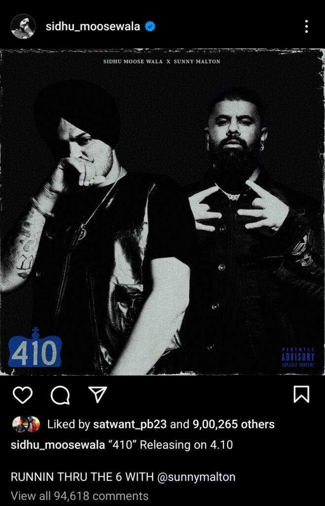ਸੰਨੀ ਨੇ ਲਿਖਿਆ ਸੀ ਕਿ ਜੇਕਰ ਉਸ ਦੀ ਪੋਸਟ ‘ਤੇ ਇਕ ਲੱਖ ਕੁਮੈਂਟ ਆ ਜਾਣ ਤਾਂ ਉਹ ਗੀਤ ਦਾ ਪੋਸਟਰ ਰਿਲੀਜ਼ ਕਰ ਦੇਣਗੇ। ਹੁਣ ਸਿੱਧੂ ਮੂਸੇਵਾਲਾ ਦੇ ਇੰਸਟਾਗ੍ਰਾਮ ਪੇਜ ‘ਤੇ ਗੀਤ ਦਾ ਪੋਸਟਰ ਸਾਂਝਾ ਕੀਤਾ ਗਿਆ ਹੈ, ਜਿਸ ‘ਚ ਸਿੱਧੂ ਤੇ ਸੰਨੀ ਦੋਵੇਂ ਦਿਖਾਈ ਦੇ ਰਹੇ ਹਨ। ਗੀਤ ਦਾ ਨਾਂ ‘410’ ਹੈ, ਜੋ ਕਿ 10 ਅਪ੍ਰੈਲ (4/10) ਨੂੰ ਰਿਲੀਜ਼ ਹੋਵੇਗਾ।