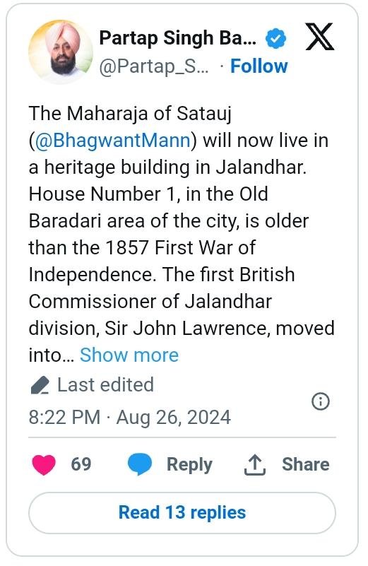 ਉਨ੍ਹਾਂ ਨੇ ਲਿਖਿਆ ਜਲੰਧਰ ਡਿਵੀਜ਼ਨ ਦੇ ਪਹਿਲੇ ਬ੍ਰਿਟਿਸ਼ ਕਮਿਸ਼ਨਰ ਸਰ ਜੌਹਨ ਲਾਰੈਂਸ 1848 ਵਿੱਚ ਇਸ ਘਰ ਵਿੱਚ ਰਹਿਣ ਲਈ ਆਏ ਸਨ। ਉਦੋਂ ਤੱਕ ਜਲੰਧਰ ਮਹਾਰਾਜਾ ਰਣਜੀਤ ਸਿੰਘ ਦੇ ਸਾਮਰਾਜ ਦਾ ਹਿੱਸਾ ਸੀ। ਇਸੇ ਤਰ੍ਹਾਂ ਆਮ ਆਦਮੀ ਪਾਰਟੀ ਦੇ ਸੁਪਰੀਮੋ ਤੇ ਦਿੱਲੀ ਦੇ ਮੁੱਖ ਮੰਤਰੀ ਅਰਵਿੰਦ ਕੇਜਰੀਵਾਲ ਨੇ ਆਪਣੀ ਰਿਹਾਇਸ਼ ਦੇ ਨਵੀਨੀਕਰਨ ‘ਤੇ 52.71 ਕਰੋੜ ਰੁਪਏ ਖਰਚ ਕੀਤੇ ਹਨ। ਹਾਲਾਂਕਿ, ਇਹ ਉਹੀ ਨੇਤਾ ਹਨ ਜਿਨ੍ਹਾਂ ਨੇ ਆਮ ਜੀਵਨ ਜਿਉਣ ਤੇ ਛੋਟੇ ਘਰਾਂ ਵਿੱਚ ਰਹਿਣ ਦਾ ਵਾਅਦਾ ਕੀਤਾ ਸੀ। ਹੁਣ ਆਮ ਜੀਵਨ ਜਿਉਣ ਦੇ ਵਾਅਦਿਆਂ ਦਾ ਕੀ ਹੋਇਆ?