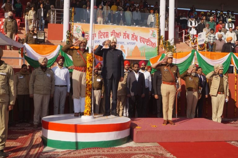 ਮਾਨਸਾ, 26 ਜਨਵਰੀ 2025 : 76ਵੇਂ ਗਣਤੰਤਰ ਦਿਵਸ ਦਾ ਜ਼ਿਲ੍ਹਾ ਪੱਧਰੀ ਸਮਾਗਮ ਸਥਾਨਕ ਬਹੁਮੰਤਵੀ ਖੇਡ ਸਟੇਡੀਅਮ, ਨਹਿਰੂ ਮੈਮੋਰੀਅਲ ਸਰਕਾਰੀ ਕਾਲਜ, ਮਾਨਸਾ ਵਿਖੇ ਹੋਇਆ, ਜਿਸ ਦੌਰਾਨ ਡਿਪਟੀ ਕਮਿਸ਼ਨਰ ਸ੍ਰੀ ਕੁਲਵੰਤ ਸਿੰਘ, ਆਈ.ਏ.ਐਸ. ਨੇ ਕੌਮੀ ਝੰਡਾ ਲਹਿਰਾਉਣ ਦੀ ਰਸਮ ਅਦਾ ਕੀਤੀ ਅਤੇ ਪਰੇਡ ਦਾ ਨਿਰੀਖਣ ਕੀਤਾ। ਇਸ ਮੌਕੇ ਜ਼ਿਲਾ ਪੁਲਿਸ ਮੁਖੀ ਸ੍ਰੀ ਭਾਗੀਰਥ ਸਿੰਘ ਮੀਨਾ ਵੀ ਉਨ੍ਹਾਂ ਦੇ ਨਾਲ ਸਨ। ਜ਼ਿਲ੍ਹਾ ਤੇ ਸੈਸ਼ਨ ਜੱਜ ਸ੍ਰੀ ਐਚ.ਐਸ. ਗਰੇਵਾਲ, ਵਿਧਾਇਕ ਮਾਨਸਾ ਡਾ. ਵਿਜੈ ਸਿੰਗਲਾ ਅਤੇ ਡੀ.ਆਈ.ਜੀ. ਬਠਿੰਡਾ ਰੇਂਜ ਸ੍ਰੀ ਹਰਜੀਤ ਸਿੰਘ ਵੱਲੋਂ ਸਮਾਗਮ ਵਿਚ ਵਿਸ਼ੇਸ਼ ਤੌਰ ’ਤੇ ਸ਼ਿਰਕਤ ਕੀਤੀ ਗਈ।
