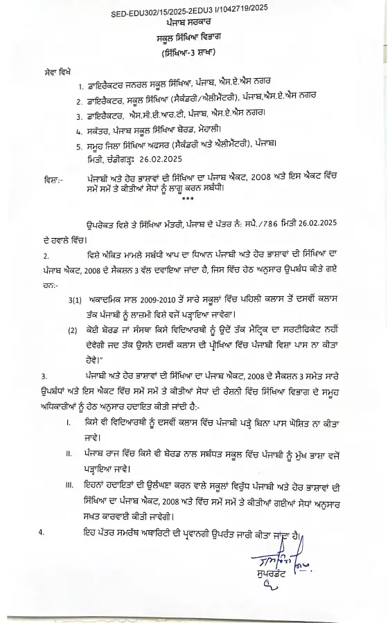 ਹਲਾਂਕਿ 2009 ਤੋਂ ਹੀ ਇਹ ਰੂਲ ਲਾਗੂ ਹੈ ਕਿ ਕੋਈ ਵੀ ਬੋਰਡ ਉਦੋਂ ਤੱਕ 10ਵੀਂ ਦਾ ਸਰਟੀਫਿਕੇਟ ਜਾਰੀ ਨਹੀਂ ਕਰੇਗਾ। ਜਦੋਂ ਤੱਕ ਵਿਦਿਆਰਥੀ 10ਵੀਂ ਪਾਸ ਨਹੀਂ ਕਰਦਾ। ਪੰਜਾਬ ਲਰਨਿੰਗ ਆਫ਼ ਪੰਜਾਬੀ ਐਂਡ ਅਦਰ ਲੈਂਗੁਏਜ਼ ਐਕਟ 2008 ਮੁਤਾਬਿਕ ਇਹ ਹੀ ਨਿਯਮ ਹੈ। ਪਰ ਹੁਣ ਸਿੱਖਿਆ ਮੰਤਰੀ ਨੇ ਇਸ ਨੂੰ ਲੈ ਕੇ ਸਖਤ ਚਿਤਾਵਨੀ ਦਿੱਤੀ ਹੈ।