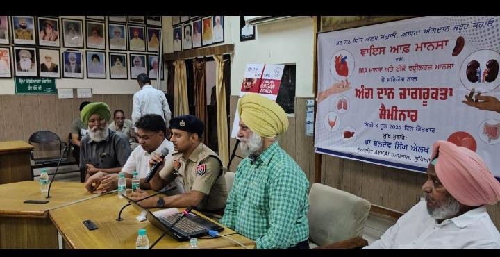 ਮਾਨਸਾ, 8 ਜੂਨ : ‘ਵਾਇਸ ਆਫ ਮਾਨਸਾ ” ਵਲੋਂ ਆਈ ਐਮ ਏ ਮਾਨਸਾ ਅਤੇ ਈਕੋ ਵੀਲਰਜ਼ ਕਲੱਬ ਨਾਲ ਮਿਲ ਕੇ ਅੰਗ ਦਾਨ ਨੂੰ ਉਤਸ਼ਾਹਿਤ ਕਰਨ ਲਈ ਕਰਵਾਏ ਗਏ ਸੈਮੀਨਾਰ ਵਿਚ ਮੁੱਖ ਮਹਿਮਾਨ ਵਜੋਂ ਸ਼ਾਮਿਲ ਹੋਏ ਐਸ ਐਸ ਪੀ ਭਗੀਰਥ ਸਿੰਘ ਮੀਣਾ ਨੇ ਇਸ ਉਦਮ ਦੀ ਸ਼ੰਲਾਘਾ ਕਰਦਿਆਂ ਕਿਹਾ ਕਿ ਸਮਾਜ ਵਿਚ ਅੱਖਾਂ ਅਤੇ ਹੋਰ ਅਹਿਮ ਅੰਗਾਂ ਦੇ ਦਾਨ ਕਰਨ ਨਾਲ ਬਹੁਤ ਸਾਰੀਆਂ ਹੋਰ ਜਿੰਦਗੀਆਂ ਬਚਾਈਆਂ ਜਾ ਸਕਦੀਆਂ ਹਨ ਪਰੰਤੂ ਇਸ ਲਈ ਅੰਗਦਾਨ ਨੂੰ ਇਸ ਤਰ੍ਹਾਂ ਦੇ ਸੈਮੀਨਾਰ ਕਰਵਾਕੇ ਲੋਕ ਲਹਿਰ ਵਜੋਂ ਉਭਾਰਿਆ ਜਾਣਾ ਚਾਹੀਦਾ ਹੈ। ਉਹਨਾਂ ਵਲੋਂ ਅੰਗਦਾਨੀ ਵਜੋਂ ਇਸ ਮੁਹਿੰਮ ਵਿਚ ਸ਼ਾਮਿਲ ਹੋਣ ਦਾ ਵੀ ਐਲਾਨ ਕੀਤਾ।