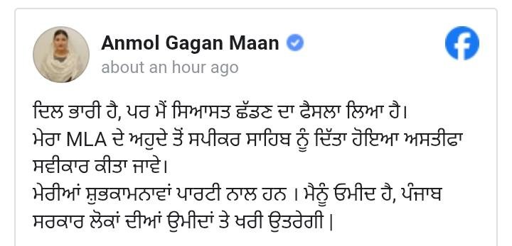 ਆਮ ਆਦਮੀ ਪਾਰਟੀ ਦੀ ਖਰੜ ਵਿਧਾਨ ਸਭਾ ਸੀਟ ਤੋਂ ਵਿਧਾਇਕ ਅਨਮੋਲ ਗਗਨ ਮਾਨ ਨੇ ਆਪਣੇ ਅਹੁਦੇ ਤੋਂ ਅਸਤੀਫਾ ਦੇ ਦਿੱਤਾ ਹੈ। ਅਨਮੋਲ ਗਗਨ ਮਾਨ ਨੇ ਫੇਸਬੁੱਕ ‘ਤੇ ਭਾਵੁਕ ਪੋਸਟ ਪਾਈ ਹੈ। ਉਨ੍ਹਾਂ ਨੇ ਕਿਹਾ ਕਿ ਮੈਂ ਸਿਆਸਤ ਛੱਡਣ ਦਾ ਫੈਸਲਾ ਲੈ ਲਿਆ ਹੈ। ਮੇਰੇ ਵਿਧਾਇਕ ਅਹੁਦੇ ਤੋਂ ਸਪੀਕਰ ਸਾਹਿਬ ਨੂੰ ਅਸਤੀਫ਼ਾ ਦਿੱਤਾ ਹੋਇਆ ਹੈ। ਜਿਸ ਨੂੰ ਸਵੀਕਾਰ ਕੀਤਾ ਜਾਵੇ। ਉਨ੍ਹਾਂ ਨੇ ਪੋਸਟ ਵਿੱਚ ਲਿਖਿਆ ਕਿ ਮੇਰੀਆਂ ਸ਼ੁਭਕਾਮਨਾਵਾਂ ਪਾਰਟੀ ਦੇ ਨਾਲ ਹਨ। ਉਨ੍ਹਾਂ ਨੇ ਕਿਹਾ ਕਿ ਮੈਨੂੰ ਉਮੀਦ ਹੈ ਕਿ ਪੰਜਾਬ ਸਰਕਾਰ ਲੋਕਾਂ ਦੀਆਂ ਉਮੀਦਾਂ ਤੇ ਖਰੀ ਉਤਰੇਗੀ।