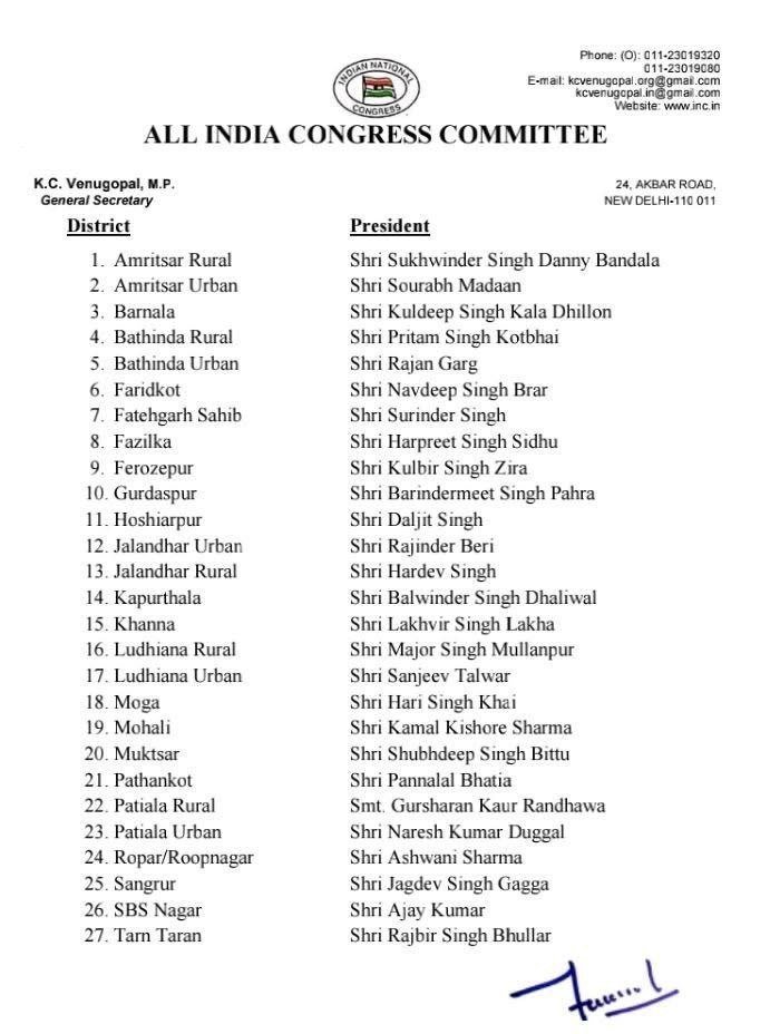 Share Facebook Twitter LinkedIn Pinterest Email ਬਿਊਰੋ, ਪ੍ਰਾਈਮ ਪੋਸਟ ਪੰਜਾਬ ਚੰਡੀਗੜ੍ਹ : ਕਾਂਗਰਸ ਪਾਰਟੀ ਵੱਲੋਂ ਪੰਜਾਬ ਦੇ ਜ਼ਿਲ੍ਹਾ ਪ੍ਰਧਾਨਾਂ ਦਾ ਐਲਾਨ ਕੀਤਾ ਗਿਆ ਹੈ। ਕਾਂਗਰਸ ਹਾਈਕਮਾਂਡ ਵੱਲੋਂ 27 ਜ਼ਿਲ੍ਹਾ ਪ੍ਰਧਾਨਾਂ ਦਾ ਐਲਾਨ ਕੀਤਾ ਗਿਆ।