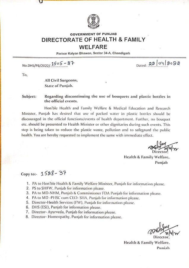 ਡਾਇਰੈਕਟਰ ਸਿਹਤ ਪੰਜਾਬ ਵੱਲੋਂ ਜਾਰੀ ਕੀਤੇ ਹੁਕਮ ਅਨੁਸਾਰ ਸਿਹਤ ਅਤੇ ਪਰਿਵਾਰ ਕਲਿਆਣ ਨਿਰਦੇਸ਼ ਨੇ ਕਿਹਾ ਕਿ ਸਿਹਤ ਮੰਤਰੀ ਨੇ ਸਿਹਤ ਵਿਭਾਗ ਦੇ ਅਧਿਕਾਰਿਤ ਸਮਾਰੋਹ/ ਪ੍ਰੋਗਰਾਮਾਂ ‘ਚ ਪਲਾਸਟਿਕ ਦੀਆਂ ਬੋਤਲਾਂ ‘ਚ ਪੈਕ ਪਾਣੀ ਦੇ ਇਸਤੇਮਾਲ ਨੂੰ ਰੋਕਣ ਦੀ ਅਪੀਲ ਕੀਤੀ ਹੈ। ਹੁਕਮਾਂ ਵਿੱਚ ਕਿਹਾ ਹੈ ਕਿ ਪੰਜਾਬ ਦੇ ਸਿਹਤ ਮੰਤਰੀ ਜਿੱਥੇ ਵੀ ਜਾਣ , ਕੋਈ ਉਸ ਨੂੰ ਫੁੱਲਾਂ ਦਾ ਗੁਲਦਸਤਾ ਨਾ ਦੇਵੇ। ਇਹ ਹੁਕਮ ਵਾਤਾਵਰਨ ਨੂੰ ਬਚਾਉਣ ਲਈ ਇੱਕ ਚੰਗੀ ਸ਼ੁਰੂਆਤ ਹੋਣ ਦਾ ਦਾਅਵਾ ਕੀਤਾ।
