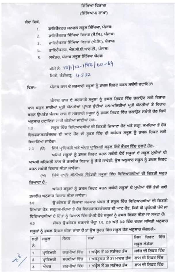 ਜਾਣਕਾਰੀ ਅਨੁਸਾਰ ਪ੍ਰਾਇਮਰੀ ਸਕੂਲਾਂ ਵਿੱਚ 1 ਅਪ੍ਰੈਲ ਤੋਂ 30 ਸਤੰਬਰ ਤੱਕ ਸਵੇਰ ਦੀ ਸ਼ਿਫਟ ਹੋਵੇਗੀ, ਜਦਕਿ ਸ਼ਾਮ ਦੀ ਸ਼ਿਫਟ 1 ਅਕਤੂਬਰ ਤੋਂ 31 ਮਾਰਚ ਤੱਕ ਹੋਵੇਗੀ। ਜਦੋਂ ਕਿ ਉਪਰਲੀ ਜਮਾਤ 1 ਅਪ੍ਰੈਲ ਤੋਂ 30 ਸਤੰਬਰ ਤੱਕ ਸ਼ਾਮ ਦੀ ਸ਼ਿਫਟ ਹੋਵੇਗੀ। ਗਰਮੀਆਂ ਵਿੱਚ, ਪਹਿਲੀ ਸ਼ਿਫਟ ਸਵੇਰੇ 7 ਵਜੇ ਤੋਂ ਦੁਪਹਿਰ 12 ਵਜੇ ਤੱਕ ਚੱਲੇਗੀ, ਜਦੋਂ ਕਿ ਦੂਜੀ ਸ਼ਿਫਟ ਦੁਪਹਿਰ 12.30 ਤੋਂ ਸ਼ਾਮ 5:30 ਵਜੇ ਤੱਕ ਹੋਵੇਗੀ। ਇਸੇ ਤਰ੍ਹਾਂ ਸਰਦੀਆਂ ਵਿੱਚ ਪਹਿਲੀ ਸ਼ਿਫਟ ਸਵੇਰੇ 7.30 ਤੋਂ 12.30 ਵਜੇ ਤੱਕ ਅਤੇ ਦੂਜੀ ਸ਼ਿਫਟ ਦੁਪਹਿਰ 12.15 ਤੋਂ ਸ਼ਾਮ 5.15 ਤੱਕ ਚੱਲੇਗੀ।