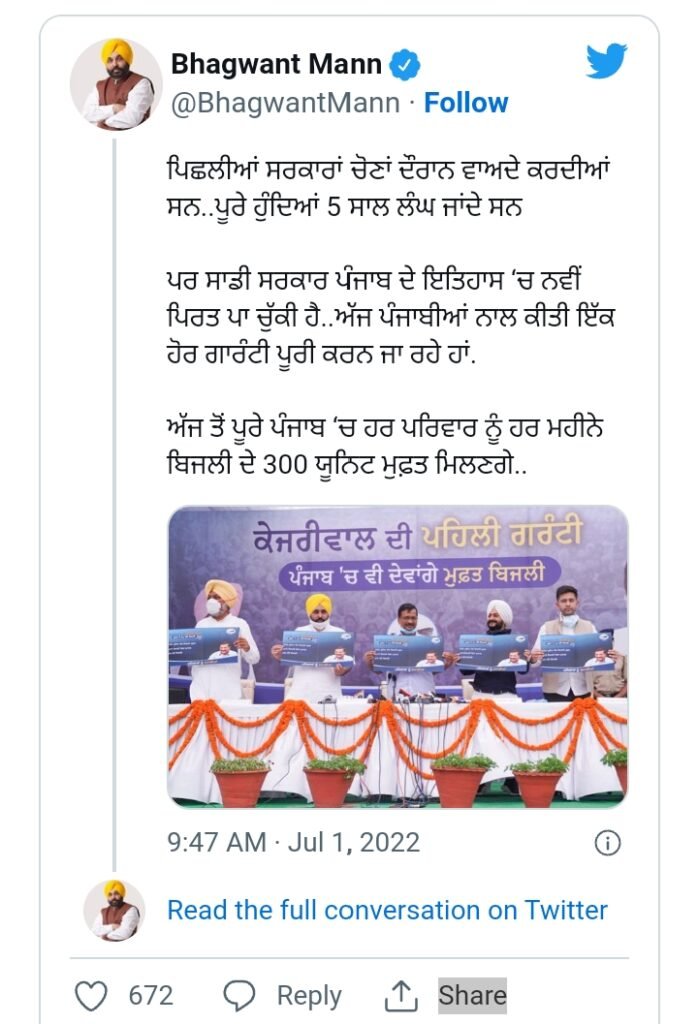 ‘ਮੁਬਾਰਕਬਾਦ ਪੰਜਾਬ…ਪਹਿਲੀ ਗਾਰੰਟੀ ਪੂਰੀ…ਅੱਜ ਤੋਂ ਹਰੇਕ ਪਰਿਵਾਰ ਨੂੰ 300 ਯੂਨਿਟ ਪ੍ਰਤੀ ਮਹੀਨਾ ਮੁਫ਼ਤ ਬਿਜਲੀ…ਸਾਡੇ ਮੁੱਖ ਮੰਤਰੀ ਭਗਵੰਤ ਮਾਨ ਜੀ ਦਾ ਸ਼ੁਕਰੀਆ…ਗਰੀਬਾਂ ਅਤੇ ਆਮ ਲੋਕਾਂ ਨੂੰ ‘ਪਾਵਰ’ ਦੇਣ ਦਾ ਕੰਮ ਸਿਰਫ਼ ਕੇਜਰੀਵਾਲ ਜੀ ਹੀ ਮੁਮਕਿਨ ਕਰ ਸਕਦੇ ਨੇ’