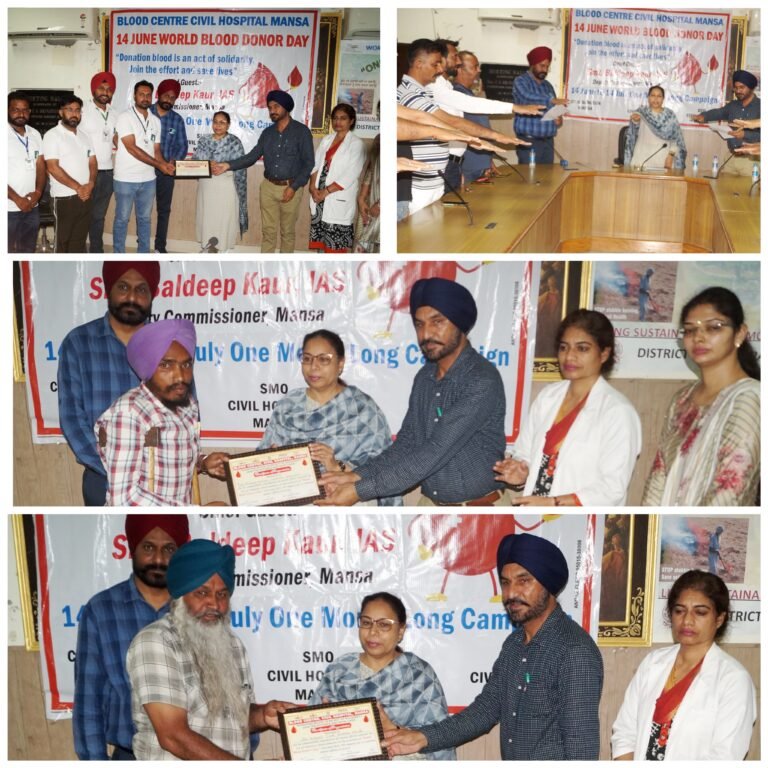 ਮਾਨਸਾ, 12 ਜੁਲਾਈ ( ਪ੍ਰਾਈਮ ਪੋਸਟ ਪੰਜਾਬ ) : ਮਨੁੱਖੀ ਸਰੀਰ ਅੰਦਰ ਖੂਨ ਦਾ ਅਹਿਮ ਯੋਗਦਾਨ ਹੈ ਅਤੇ ਖੂਨਦਾਨ ਕਰਨਾ ਸਭ ਤੋਂ ਵੱਡਾ ਦਾਨ ਹੈ। ਖੂਨਦਾਨ ਕਰਕੇ ਦੂਜੇ ਵਿਅਕਤੀ ਨੂੰ ਜੀਵਨ ਦੀ ਦਾਤ ਦਿੱਤੀ ਜਾ ਸਕਦੀ ਹੈ। ਇਹਨਾਂ ਵਿਚਾਰਾਂ ਦਾ ਪ੍ਰਗਟਾਵਾ ਡਿਪਟੀ ਕਮਿਸ਼ਨਰ ਬਲਦੀਪ ਕੌਰ ਨੇ ਅੱਜ ਸਥਾਨਕ ਬੱਚਤ ਭਵਨ ਵਿਖੇ ਸਿਹਤ ਵਿਭਾਗ ਵੱਲੋਂ ਰੱਖੇ ਸਾਦੇ ਸਮਾਗਮ ਦੌਰਾਨ ਜ਼ਿਲ੍ਹੇ ਦੀਆਂ ਵੱਖ-ਵੱਖ ਸਮਾਜ ਸੇਵੀ ਸੰਸਥਾਵਾਂ ਨੂੰ ਸਨਮਾਨ ਕਰਨ ਦੌਰਾਨ ਕੀਤਾ।
