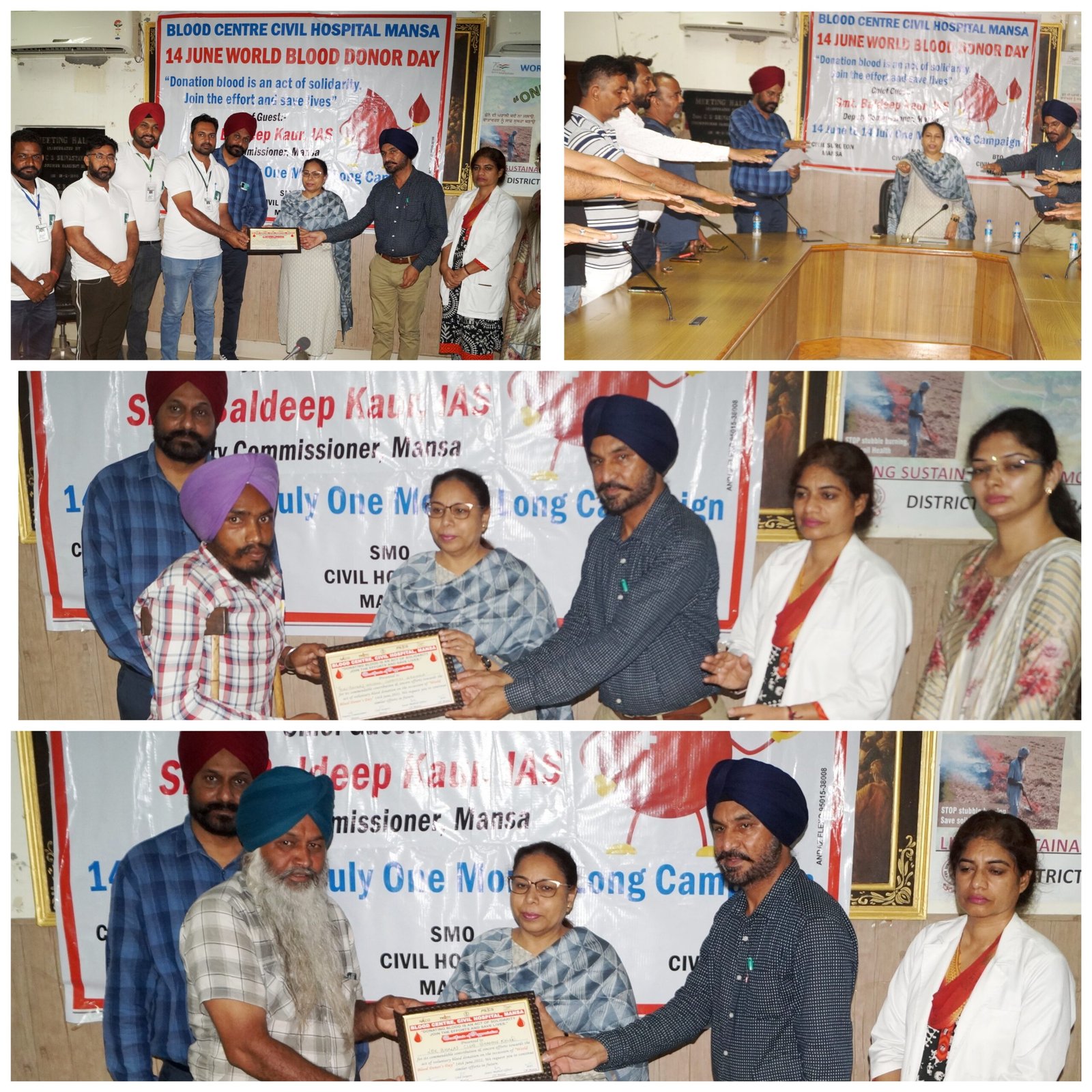 ਉਨ੍ਹਾਂ ਕਿਹਾ ਕਿ ਬਹੁਤ ਖੁਸ਼ੀ ਦੀ ਗੱਲ ਹੈ ਜ਼ਿਲ੍ਹਾ ਮਾਨਸਾ ਦੀਆਂ ਐਨ.ਜੀ.ਓ ਵਿਸ਼ੇਸ ਕਰਕੇ ਨੌਜਵਾਨ ਖੂਨਦਾਨ ਦੇ ਨੇਕ ਕਾਰਜ਼ ਵਿੱਚ ਵੱਧ ਚੜ੍ਹ ਕੇ ਹਿੱਸਾ ਲੈ ਰਹੇ ਹਨ ਜੋ ਕਿ ਸਹੀ ਅਰਥਾਂ ਵਿੱਚ ਸੱਚੀ ਸਮਾਜ ਸੇਵਾ ਹੈ। ਉਨ੍ਹਾਂ ਕਿਹਾ ਕਿ ਸਾਡਾ ਜੀਵਨ ਮਾਨਵਤਾ ਦੀ ਸੇਵਾ ਲਈ ਸਮਰਪਿਤ ਹੋਣਾ ਚਾਹੀਦਾ ਹੈ ਜਿਸਦੇ ਲਈ ਜ਼ਿਲ੍ਹੇ ਦੀਆਂ ਸਮੂਹ ਸਮਾਜ ਸੇਵੀ ਸੰਸਥਾਵਾਂ ਵਧਾਈ ਦੀਆਂ ਹੱਕਦਾਰ ਹਨ, ਜੋ ਖੂਨਦਾਨ ਦੇ ਨੇਕ ਕਾਰਜ਼ ’ਚ ਆਪਣਾ ਯੋਗਦਾਨ ਪਾ ਰਹੀਆ ਹਨ। ਉਨ੍ਹਾਂ ਵੱਖ-ਵੱਖ ਸਮਾਜ ਸੇਵਾ ’ਚ ਵੱਡਮੁੱਲਾ ਯੋਗਦਾਨ ਪਾਉਣ ਵਾਲੀਆਂ ਵੱਖ-ਵੱਖ ਸਮਾਜ ਸੇਵੀ ਸੰਸਥਾਵਾਂ ਨੂੰ ਸਨਮਾਨ ਕਰਨ ’ਤੇ ਖੁਸ਼ੀ ਪ੍ਰਗਟਾਈ ਅਤੇ ਭਵਿੱਖ ਅੰਦਰ ਅਜਿਹੇ ਨੇਕ ਕੰਮਾਂ ’ਚ ਵੱਧ ਚੜ੍ਹ ਕੇ ਸਹਿਯੋਗ ਕਰਨ ਦੀ ਅਪੀਲ ਕੀਤੀ।