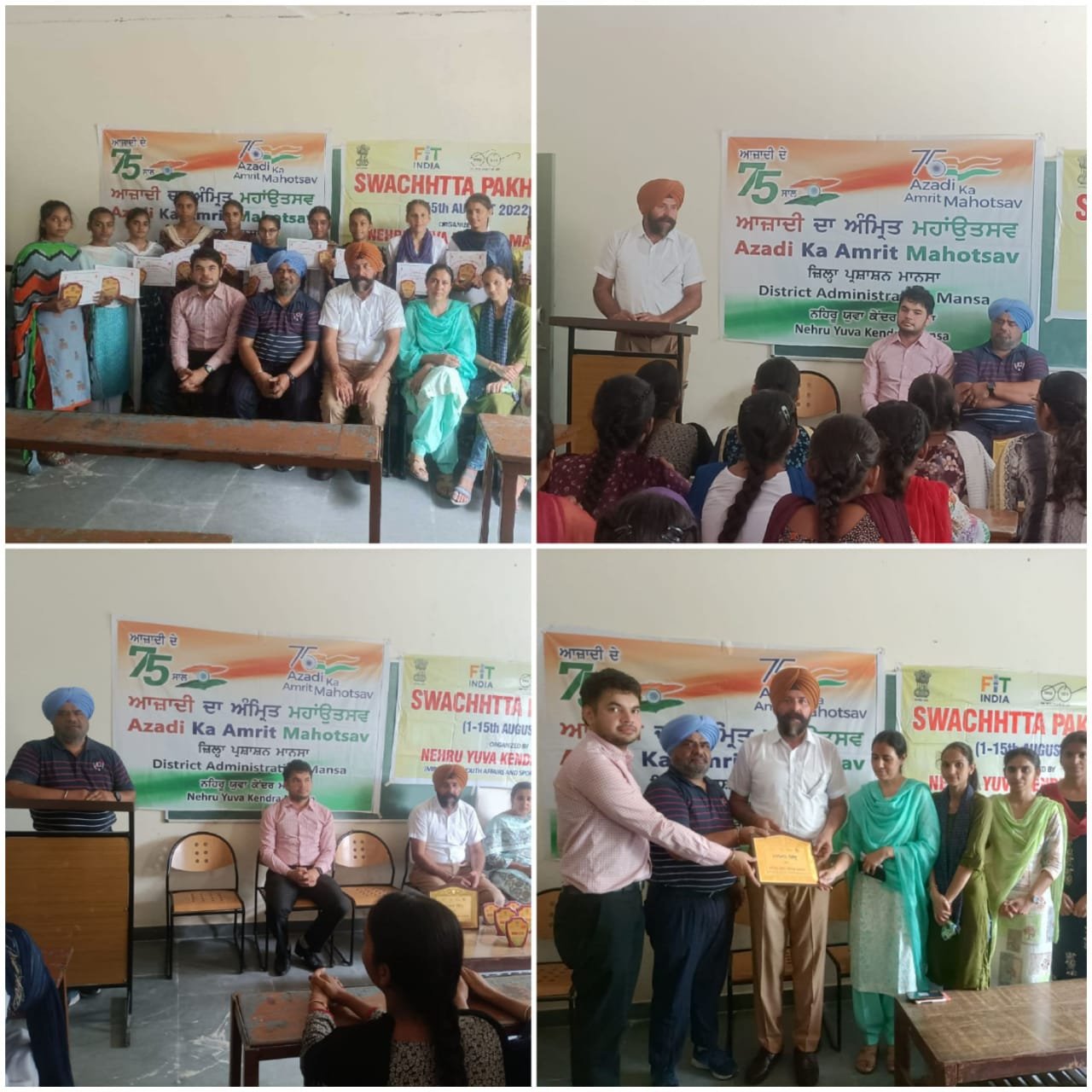 ਮਾਨਸਾ, 17 ਅਗਸਤ ( ਪ੍ਰਾਈਮ ਪੋਸਟ ਪੰਜਾਬ ) : ਨਹਿਰੂ ਯੁਵਾ ਕੇਂਦਰ ਮਾਨਸਾ ਵੱਲੋਂ ਹਰ ਸਾਲ ਦੀ ਤਰ੍ਹਾਂ ਇਸ ਸਾਲ ਵੀ ਸਵੱਛਤਾ ਪੰਦਰਵਾੜਾ ਵੱਖ ਵੱਖ ਯੂਥ ਕਲੱਬਾਂ ਦੇ ਸਹਿਯੋਗ ਨਾਲ ਮਨਾਇਆ ਗਿਆ।ਅਜ਼ਾਦੀ ਦੇ 75 ਵੇਂ ਅੰਮ੍ਰਿਤ ਮਹਾਉਤਸਵ ਨੂੰ ਸਮਰਪਿਤ ਇਸ ਪੰਦਰਵਾੜੇ ਦੌਰਾਨ ਯੂਥ ਕਲੱਬਾਂ ਵੱਲੋਂ ਪਿੰਡ ਦੀਆਂ ਸਾਂਝੀਆਂ ਥਾਵਾਂ ਸਕੂਲਾਂ,ਖੇਡ ਮੈਦਾਨ ਪਿੰਡ ਦੇ ਪਾਰਕ ਅਤੇ ਸ਼ਹੀਦਾ ਦੀ ਯਾਦ ਬਣਾਏ ਗਏ ਬੁੱਤਾਂ ਦੀ ਸਾਫ ਸਫਾਈ ਕੀਤੀ ਗਈ।ਇਸ ਤੋਂ ਇਲਾਵਾ ਬੱਚਿਆਂ ਵਿੱਚ ਸਵੱਛਤਾ ਸਬੰਧੀ ਜਾਗਰੂਕਤਾ ਕਰਨ ਹਿੱਤ ਪੋਸਟਰ ਭਾਸ਼ਣ,ਲੇਖ ਮੁਕਾਬਲੇ ਵੀ ਕਰਵਾਏ ਗਏ।ਸਵੱਛਤਾ ਪੰਦਰਵਾੜੇ ਦਾ ਸਮਾਪਤੀ ਸਮਾਗਮ ਅਤੇ ਇਨਾਮ ਵੰਡ ਸਮਾਰੋਹ ਭਾਈ ਬਹਿਲੋ ਖਾਲਸਾ ਗਰਲਜ ਕਾਲਜ ਫਫੜੇ ਭਾਈਕੇ ਵਿੱਚ ਕਰਵਾਇਆ ਗਿਆ।